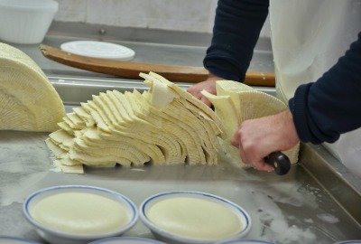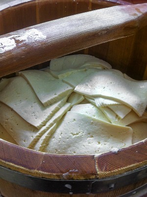 Il formaggio tagliato viene messo nella cisca, un recipiente di legno