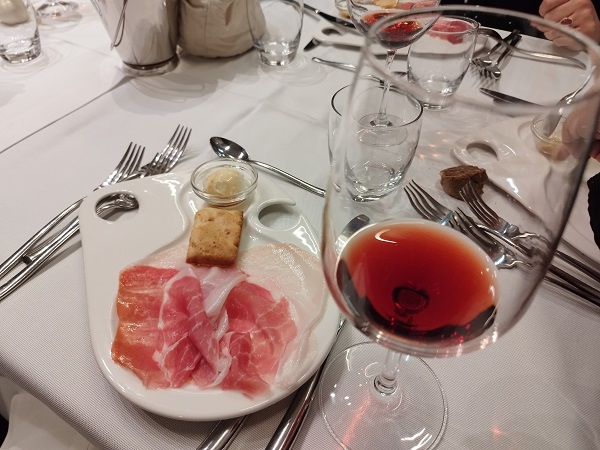 subito dopo, il Gambero di Mazara con lardo di Suino Nero dei Nebrodi e miele di asfodelo di ape nera sicula, di delizia sopraffina preparato dalla brigata di “Cas&Putia”. Qui, è la volta di vini “Palari” etnei: ecco farsi largo il “Rocca Coeli” che è un Etna Bianco Doc 2019 (Carricante e Minnella). “L’accostamento cibo – vino sta vivendo una trasformazione copernicana – evidenzia Geraci – ed anche la coscienza del fruitore si è modificata e va al di là dei consigli tradizionali”.