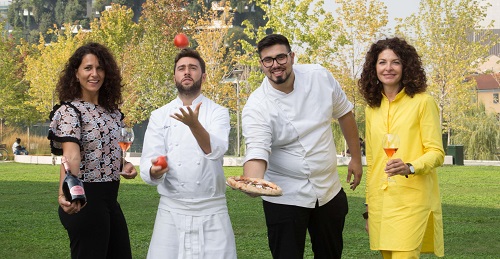 Anche i due pizzaioli sembrano i rappresentanti di due mondi diversi: Oliva il classico napoletano (lo scugnizzo, in senso buono, simpatico e di compagnia) dalla parlantina facile e veloce, allegro anche per la giovane età, pronto alla battuta e grande comunicatore che riesce a convincere i clienti a mangiare in continuazione; Greco ragazzone timido, composto tanto da parlare il minimo sindacale che, però, è l’esempio di passione e professionalità. Anche Oliva e Greco rappresentano due mondi che difficilmente si sarebbero potuto incontrare. Quando lo hanno fatto, grazie e mister Pandenus (insegna che si rifà al vecchio detto milanese “Pan e nus, mangia de spus”, cioè “Pane e noci, cibo da sposi”) e all’antica Maison Ruinart – rappresentata da Silvia Rossetto e Francesca Terragni, che hanno raccontato la filosofia alla base del progetto -, c’è stata un’esplosione di piacere tra le proposte di Oliva (Il ricordo della domenica, a base di pomodoro datterino, olio, prezzemolo e salsa di vongole accompagnato da “R” De Ruinart); Pizza, burro, salmone, caviale servito con una flute di Ruinart rosé – abbinamento da manuale, veramente da non perdere – e Pacchianella (pomodoro San Marzano, pomodorini datterino, olive, capperi, alici, origano e aglio e sempre con Ruinart Rosé). E, Greco che ha risposto con Pan de nus (farina di grano tenero, semola di grano duro rimacinata, segale, noci, fior di latte e zola) servito con “R” De Ruinart. Proseguendo con “Baccalà” (farina di grano tenero, semola rimacinata di grano duro e farina integrale macinata a pietra) su base focaccia e “acciuga” (farina di grano tenero, semola rimacinata di grano duro, farina integrale macinata a pietra, salsa di pomodoro San Marzano, bufala stracciata, acciuga del Cantabrico salsa al prezzemolo, abbinati al Ruinart Rosé.