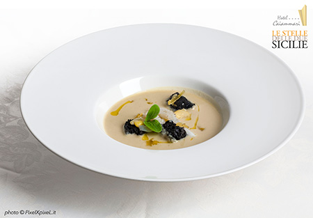 Passatina di cicerchie, biscotto al nero e seppie con limone candito