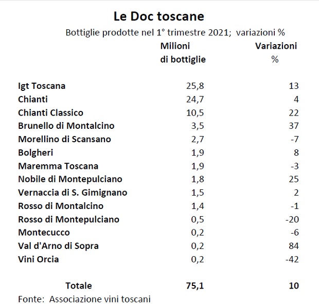 Nel primo trimestre del 2021 l’imbottigliato delle Doc toscane aumenta del 10% rispetto all’analogo periodo del 2020. Circa 7 milioni di bottiglie in più. Il totale fa oltre 75 milioni di fascette di fascette delle 14 principali denominazioni toscane, di cui le prime 4 si ritagliano l’80% dei volumi. Il balzo del primo trimestre si spiega anche con il confronto positivo anno su anno: infatti il 9 marzo 2020 in Italia scattò il lockdown generalizzato, che coinvolse anche ristoranti e bar. Ad aprile e maggio la crescita dovrebbe consolidarsi ulteriormente sempre per effetto del confronto statistico favorevole, ma probabilmente si sommerà anche il trend positivo della riapertura progressiva di Stati Uniti e Regno Unito, grandi mercati esteri del Brunello, grazie a un piano vaccinale che procede velocemente.