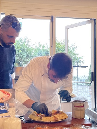 A presentare, e preparare dal vivo, le due ricette in degustazione sono stati Davide Federico di “Quid” a Palermo e Giuseppe Lino di “Mastunicola” a Palermo. Davide Federico, ventiquattro anni, dal 2019 nello staff di “Quid”, ha presentato la sua “Alicia”, pizza il cui nome è ispirato a uno dei principali ingredienti che la compongono. Realizzata con un impasto ottenuto da un blend di farine di tipo uno e zero, con una lievitazione di 36 ore, viene servita con una base di mozzarella fiordilatte e olive nere siciliane e successivamente condita a crudo con coppa di maiale artigianale, rucola, stracciatella campana e alici di Cetara. In abbinamento è stato servito un Prosecco Santi Millesimato Extra Dry Valdobbiadene 2020 presentato da Tiziana Mori in rappresentanza del Gruppo Giv.
