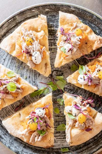 Sorce propone una pizza proviene da usi grecanici. Infatti l’impasto è fatto con il 15 % di farina di ceci e una biga di farina “0” condita con zucca rossa saltata in padella, uno stufatino di filetto di suino bianco cotto nel forno a legna a fuoco spento (un piatto tipico delle nonne agrigentine), mousse di capra girgentana, marmellata di mandarino tardivo, sesamo nero e germogli eduli. Uno spettacolare trionfo di sapori ancestrali, di odori inebrianti e dai sapori conturbanti. Un vero trionfo della innovazione delle tradizioni. La delicata spinta acida della marmellata provvede a bilanciare perfettamente la saapidità del formaggio e della carne (peraltro ben aromatizzata), ottimizzato con un giro di olio evo e pepe.