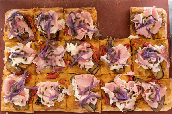 La Spada invece ha proposto una pizza che magnifica l’ortaggio siciliano per elezione, la melanzana. Su una base precotta di farina di tipo 1 con l’aggiunta del 15% di farina di grano antico Perciasacchi, viene condita da tre consistenza della melanzana violetta: in mousse, ottenuta da una brasatura, frullata con pomodorino siccagno confit; grigliata e condita con olio di oliva, aglio e sedano; le sue bucce tagliate a joulienne e cotte a bassa temperatura. Il tutto viene ulteriormente accompagnato da un prosciutto cotto affumicato con legno di faggio, bacche di ginepro e da una mousse di basilico e noci. Il sapore intenso di grani perciasacchi emotivamente in connubio con la melanzana trattata con estrema delicatezza ed incisività. Un volo pindarico gastronomico che si spinge nei vertici dell’empireo dei pizzaioli italiani. Dall’inizio alla fine della degustazione si ha un persistente ricordo del boccone.