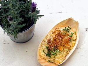 Tra le proposte tedesche, di ispirazione bavarese, spicca il banco di Heisser Hobel. Il piatto è uno solo, ed è un simbolo: i Kässpatzen, preparati al momento sotto gli occhi del pubblico, con tre formaggi diversi. La punta di diamante è il Bergkäse, un formaggio d’alpeggio dell’Algovia prodotto dalla biocasearia familiare Obere Mühle. Completano il piatto cipolle tostate, pepe nero ed erba cipollina. Il progetto, nato come food trailer, è un esempio di scelta attenta della materia prima e precisione esecutiva bavarese. In abbinamento, una Helles, birra a bassa fermentazione leggera, maltata e poco amara.