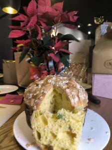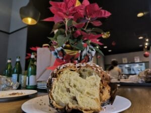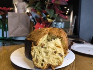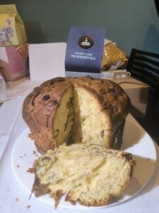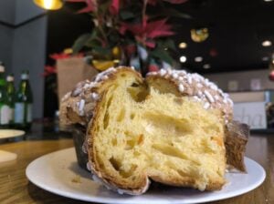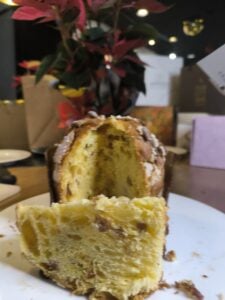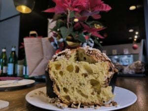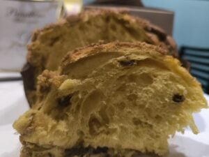 La crosta, volutamente irregolare, è ricca di mandorle e zucchero. All’interno l’impasto mostra alveoli pronunciati e una presenza generosa di canditi e uvetta. In bocca il finale resta ordinato, con una dolcezza controllata che chiude senza appesantire.