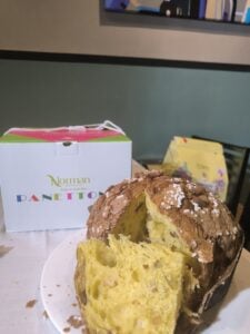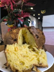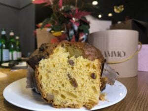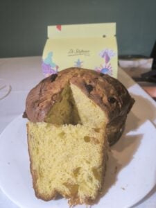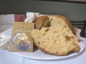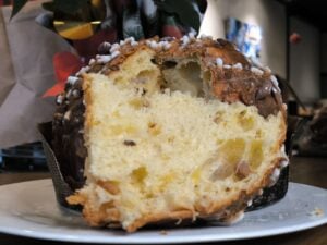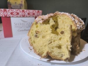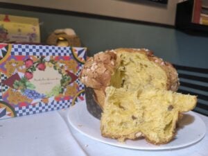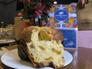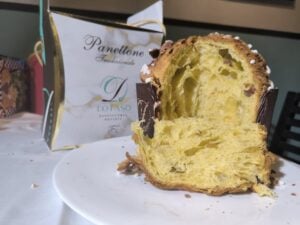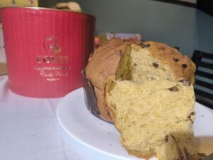 La cupola arrotondata, dal colore dorato, è arricchita da mandorle e zuccherini distribuiti con cura. Al taglio l’alveolatura è ampia e regolare, con frutta candita e uva passa ben integrate. Al naso emergono burro, vaniglia e agrumi canditi. In bocca l’impasto è scioglievole, con una persistenza lunga e ordinata.