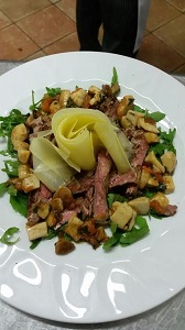 (Carpaccio di carciofi, caprino e miele; carpaccio di carne con scaglie di ragusano Dop; tagliata di vitello con funghi porcini e ragusano Dop; risotto ai carciofi su fonduta di ragusano Dop fresco)