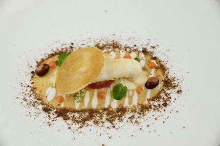Dal mare di Aspra all’oceano indiano è quasi un attimo e subito dopo ti ritrovi in tavola “Viaggio in India”, un omaggio dello chef ad un paese che lo ha accolto e profondamente colpito in un recente viaggio. Si tratta di puri, il pane indiano fritto, servito con spuma di patate, su un blend di verdure spontanee con agnello cotto in forno a legna, selezione di spezie (cardamomo, coriandolo, cumino e peperoncino), caviale e plancton sul fondo del piatto che manda dritto al naso una forte suggestione di mare. Le spezie in questo piatto sono addomesticate al gusto occidentale, l’agnello è morbido e succoso e le verdure arrotondano il gusto. Un breve ma intenso viaggio.