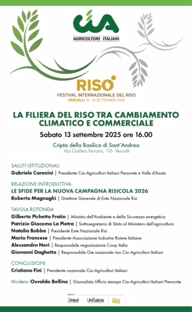 Sabato 13 settembre il dibattito si sposterà sulla sfida della filiera risicola tra cambiamenti climatici e dinamiche di mercato. L’incontro, ospitato nella suggestiva Cripta della Basilica di Sant’Andrea, vedrà al centro gli interventi di istituzioni, rappresentanti dell’industria e della distribuzione, oltre ai vertici di Cia e dell’Ente Risi. Un confronto che mette a fuoco le prospettive per la nuova campagna agricola e la necessità di strategie comuni per tutelare un prodotto che rappresenta non solo un comparto economico, ma anche una parte essenziale della cultura gastronomica italiana. Qui il programma.