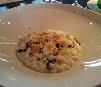 Essenziale, fresco e dall’evidente rimando alla raffinata sensibilità orientale, il primo piatto, calamari al nero di seppia con crema di piselli in abbinamento ad un calice di Ferrari brut millesimato Trento Doc 2008.