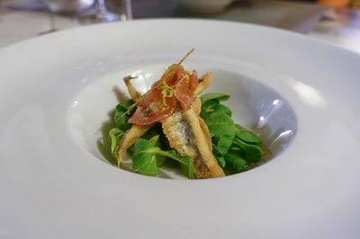 Come ad esempio il suo benvenuto, alici fritte con cipolla agrodolce allo zenzero, lisca croccante e limone verdello o l’insalata vastasa di sgombro, servita come antipasto su vellutata di patate allo zafferano, sgombro scottato, fagiolini, crumble di capperi e olive e polvere di pomodoro.
