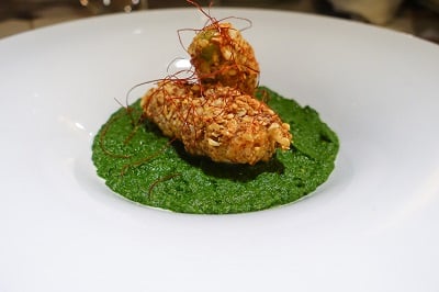 Molto richiesti anche i fiori di zucca con panatura croccante ripieni di mousse di mozzarella e gamberi, su salsa verde al prezzemolo.