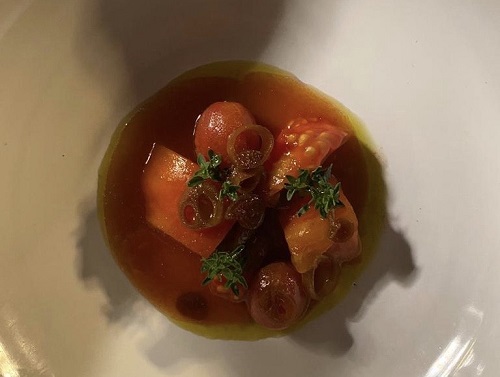 Secondo piatto è l’Insalata di Pomodoro: cuori di bue macerati, scalogno alla soia, semi di pomodoro, datterini cotti nella calce, olio di raspi del pomodoro, acqua di pomodoro. Con questo piatto vivi una sensazione: un po’ come quando, finalmente, ti accorgi di avere avuto tutta la bellezza del creato a portata di mano, di occhi e di bocca. E la vedi, la tocchi, la mastichi. Un piatto che rivela nell’estrema semplicità il carattere mediterraneo del Sud. Sapidissimo e fresco.
