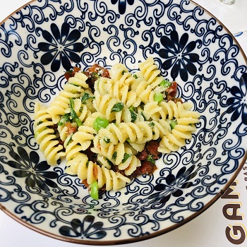 La seconda proposta sono delle mezze penne in brodetto di scoglio e curcuma, con un fondente di borlotti. Un piatto dal sapore di mare molto intenso, che si sposa perfettamente con la crema di legumi. Sapori tipici che si succedono in bocca, con l’avvolgenza della crema che viene esaltata dalla sapidità di vongole e seppie.