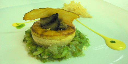 Frullare la ricotta con la polpa di zucca e un uovo, sale e pepe. Versare il composto in 4 stampini di alluminio già oliati e infarinati. Cuocere a bagnomaria per 15 minuti a 165°c. Lavare bene le foglie di lattuga, sbollentarle in acqua salata per 2 minuti, passarle in una pentola con olio, sale, pepe e zucchero, cuocere per 5 minuti e sfumare con l’aceto rosso. Togliere dal fuoco e tagliare tutto a listarelle. Pulire i funghi e tagliarli a cubetti, saltarli con dell’olio, uno spicchio d’aglio e una foglia di alloro, dopo 5 minuti salare e pepare.