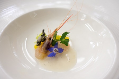 Il secondo è affidato a Pietro D’Agostino, una stella Michelin de La Capinera a Taormina e mente della manifestazione Etna&ChicChef. Lui porta in tavola un Gambero in versione autunnale. L’ingrediente principale, il gambero, arriva da Porto Palo e viene servito in crosta di sesamo del siracusano, con una crema di pinoli di Piazza Armerina, cipollotto in agrodolce, cialda di riso nero e un agrodolce al mosto d’uva. La copertura di sesamo toglie al gambero un po’ di dolcezza, aggiungendo croccantezza e una leggera nota di tostatura. L’agrodolce completa il piatto. In abbinamento Etna Rosso Muscamento 2013, Fischetti.