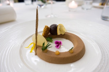 Per il dessert la mano torna al padrone di casa, Elia Russo, che propone un elegante Girotondo di cioccolato gianduia con croccante di mandorle e rosmarino, gelée al pompelmo e sfera al cioccolato con ganache di arancia rossa che viene servito in abbinamento al Ben Ryé 2011 di Donnafugata.