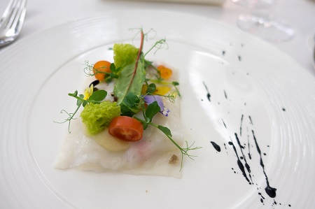 Il benvenuto agli ospiti lo ha dato il padrone di casa, Elia Russo, da tre anni chef a Villa Neri, con Gambero di nassa all’origano, arancia e latte di mandorla pizzuta e, a seguire,