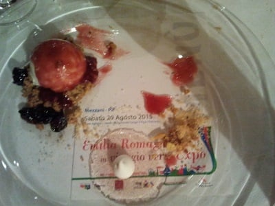(Crema di riso alla vaniglia, pesto di amarene alla rosa, croccante di sbrisolona di riso e gelèe di Gino Fabbri)