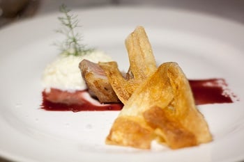 (Agnello da latte con riduzione di Nero dell'Etna, quenelle di bufala e chips di patate)