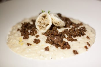 (Risotto con salsiccia battuta al ceppo affumicata con caviale di tartufo nero)