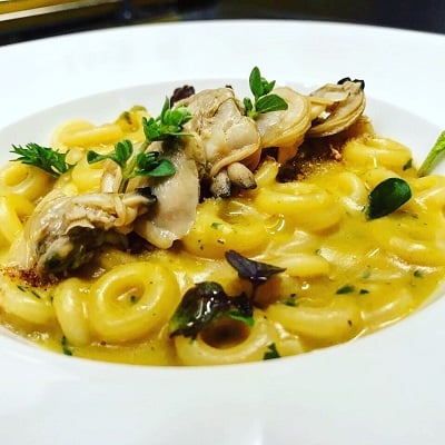 (Anelletti, tenerumi, pomodoro pelato di Aragona, fonduta di caciocavallo di vacca Cinisara, aglio di Nubia, mollica – Villa Costanza)