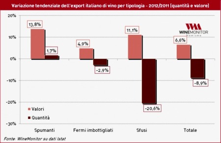 La ricerca Iri per Vinitaly dettaglia le dinamiche delle vendite: i vini a denominazione d’origine, nella classica bottiglia da 0,75 litri, continuano a performare molto bene, seguendo un trend che prosegue da anni: i vini Doc crescono del 4,8% a volume e del 10,8% a valore; i vini Igp crescono del 3,6% a volume e del 8,1% a valore. Le bollicine vendono più del vino, registrando una crescita rilevante del 27,1%. Male tutti gli altri formati: bottiglioni di vino comune, brik, bag in box. Le bottiglie a marca del distributore (Mdd) crescono del 3,0% nel formato da 0,75lt, ma calano del 2,9% nel totale. Per quanto riguarda i prezzi, prosegue la tendenza degli ultimi anni di una progressiva rivalutazione del valore del vino nella DM: 3,9 euro a bottiglia il prezzo medio complessivo del vino, 5,6 euro a bottiglia delle bollicine.