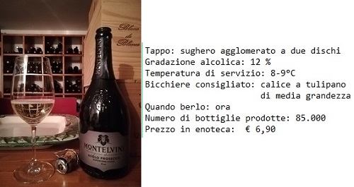 Nel calice il vino si presenta di colore giallo paglierino con un perlage persistente e abbastanza fine. All’olfatto è delicato e fragrante con profumi di fiori bianchi e mela. Segue un palato fresco con discreta struttura, briosità e cremosità date dalle bollicine e gusto morbido e fruttato. E’ molto equilibrato e si beve con piacere in ogni occasione. Ottimo come aperitivo, può essere la scelta giusta per le calde giornate estive in abbinamento a diversi piatti della cucina di mare, molluschi e crostacei in particolare.