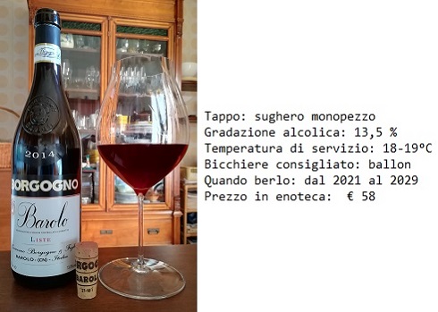Degustiamo il Barolo Docg Liste 2014, un vino che riesce a mostrare il valore del cru da cui proviene anche in annate complicate come questa. Liste è caratterizzato da un suolo di marne calcareo argillose ricco di macro e micro elementi che permettono di ottenere prodotti di grande complessità e longevità. La porzione di proprietà di Borgogno è esposta a sud e sud-est e si estende per 6,75 ettari ad un’altitudine compresa tra 270 e 330 metri sul livello del mare. Le uve vengono vendemmiate durante la prima metà di ottobre. La fermentazione non prevede aggiunta di lieviti e ha la durata di circa 12 giorni con successiva macerazione a cappello sommerso a 29 gradi per un periodo variabile da 40 a 60 giorni. La malolattica ha luogo dopo la svinatura e si protrae per due settimane alla temperatura di 22 gradi. Il vino matura per 4 anni in botti di rovere di Slavonia e, successivamente, affina in bottiglia per 6 mesi. Nel calice offre un colore rosso granato scarico. Al naso è leggermente austero, elegante e complesso con note floreali, spezie orientali, sentori di radici e una punta balsamica. Il sorso è fresco, pieno, di buon corpo, con tannini robusti che il tempo levigherà per far si che si raggiunga un equilibrio ancora maggiore. Lunga la persistenza. Molto giovane, evolverà per anni. Da abbinare a grandi piatti a base di carne, stracotti, bolliti, ma anche a formaggi stagionati.