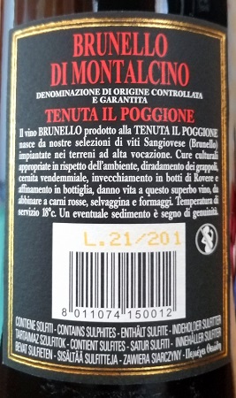 Nel calice si presenta di colore rosso granato, scuro e abbastanza carico. E’ intenso all’olfatto con nitidi profumi di marasca, prugna, una nota di fiori appassiti, un tocco di sottobosco e un cenno speziato. Il frutto appare integro e maturo. Al palato si caratterizza per il buon equilibrio, la giusta struttura e, soprattutto, per i tannini fitti e robusti che mostrano un profilo giovanile, risultando comunque molto ben estratti. Non manca la freschezza. Lungo, leggermente sapido e appena tostato il finale. E’ un Brunello nel quale la decisa trama tannica del Sangiovese dona incisività ad un insieme che ha già una buona quadratura, ma con il tempo, come è giusto aspettarsi da un vino di questa tipologia, acquisterà maggiore complessità e un’armonia ancora più compiuta. Buono il potenziale evolutivo. Bevetelo con le carni rosse, la selvaggina e i formaggi stagionati.