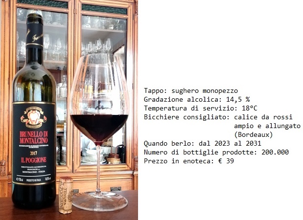 Varia la gamma di etichette con due Brunello di Montalcino, di cui uno Riserva fatto con le uve di Vigna Paganelli, la parcella di maggior pregio, un Rosso di Montalcino, alcuni vini Igt, uno spumante, un Vin Santo e un Moscadello di Montalcino. Degustiamo il Brunello di Montalcino 2017, un vino ben riuscito che, oltre ad esserci piaciuto, merita particolare attenzione almeno per tre ragioni: viene prodotto in una certa quantità di bottiglie, cosa non comune per questa qualità e questa denominazione, è venduto ad un prezzo più che adeguato per la tipologia e mantiene un profilo nel quale gli eccessi che ci aspetteremmo da un’annata calda come la 2017 sono davvero molto contenuti.
