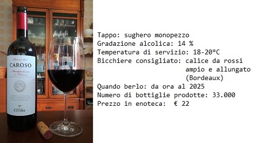 Sono presenti diverse certificazioni ambientali e di qualità. Preziosissima la collaborazione dell’enologo Riccardo Cotarella e del suo team, iniziata nell’agosto 2017. Annualmente vengono prodotte oltre 20 milioni di bottiglie, divise in diverse linee di vini Doc, Dop e Igp. Codice Citra è presente in 50 Paesi del mondo. Degustiamo il Montepulciano d’Abruzzo Doc Riserva Caroso 2013, un rosso di notevole potenza e buona armonia adatto ad impreziosire pranzi o cene con piatti ricchi dai sapori intensi.