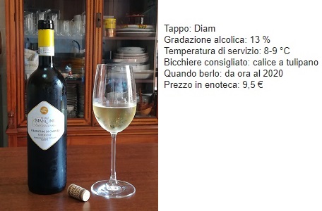 E’ ottenuto dall’omonima varietà di uve attraverso una fermentazione termocontrollata a 18 gradi. Viene poi affinato in acciaio per alcuni mesi prima dell’imbottigliamento. Nel calice si presenta di colore giallo paglierino tenue con riflessi verdolini. Offre un naso pulito di buona intensità con profumi di pesca gialla, accattivanti note floreali e sentori di macchia mediterranea. Al palato mostra una discreta struttura, un quadro aromatico corrispondente all’olfatto e un sapido finale. Ottimo l’equilibrio generale che si stabilisce tra le varie componenti. Nel complesso è un vino snello e spontaneo che si beve volentieri a qualsiasi ora del giorno e in tutte le occasioni. E’ ottimo come aperitivo, ma sicuramente dà il meglio di sé con la cucina di mare. Si può abbinare a un gran numero di piatti, da quelli a base di molluschi e crostacei alle preparazioni di pesce un po’ più elaborate. E’ importante sottolineare che si tratta di un prodotto proposto ad un prezzo davvero conveniente.