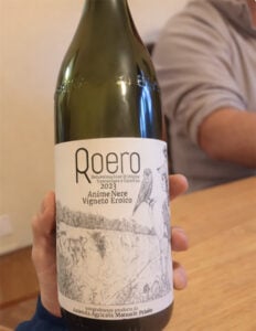 Ci mostra, da sei ampolle, i vari suoli che caratterizzano in maniera netta il Roero, argomentando da una mappa le varie ere geologiche e le formazioni. Il suo “Anime Nere”, questo il nome del cru, è un vitigno eroico, a picco su una rocca in continua evoluzione, la stessa che si trova sulla sua etichetta.