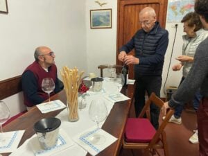 Comprò un bosco vent’anni fa, per salvarlo dalla depredazione che sarebbe poi avvenuta in nome dei mercati. Ha due tavoli d’assaggio con almeno quaranta bottiglie su cui pone la data d’apertura con un pennarello bianco; alcune sono aperte da otto mesi, e il vino tiene meravigliosamente.